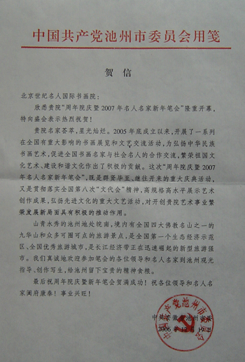 2006年12月19日,中共安徽省池州市委为北京世纪名人国际书画院成立一周年发来贺电{池明电【2006】17号}。