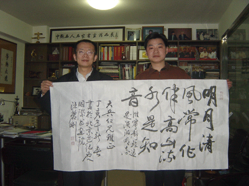 2007年3月11日晚,中国银行总行党务工作部副部长贾天兵莅临本院交流,本院秘书长汪碧刚接待贾天兵副部长一行并将自己的书法作品赠送给贾天兵副部长。