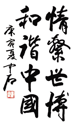 欧阳中石先生题写“第五届中国名人名家书画精品展”展览主题 “情系世博 和谐中国”