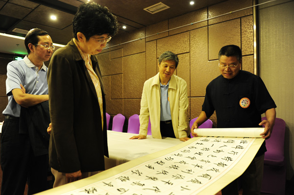 中国文联党组书记、副主席赵实,中国文联党组成员、书记处书记罗成琰,中共四川省委常委、宣传部长吴靖平,中国书协分党组书记、驻会副主席兼秘书长陈洪武等领导同志出席书法长卷捐赠仪式,并同作者合影留念。中国文联文艺志愿服务中心主任、中国文艺志愿者协会副主席兼秘书长廖恳主持了捐赠仪式。