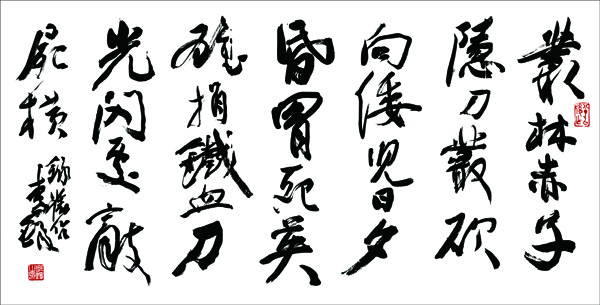 李铎书法《自作诗•纪念抗战胜利》:“丛林赤子隐刀丛,砍向倭儿日夕昏。冒死英雄捐铁血,刀光闪处敌尸横。” 尺寸:137X69cm