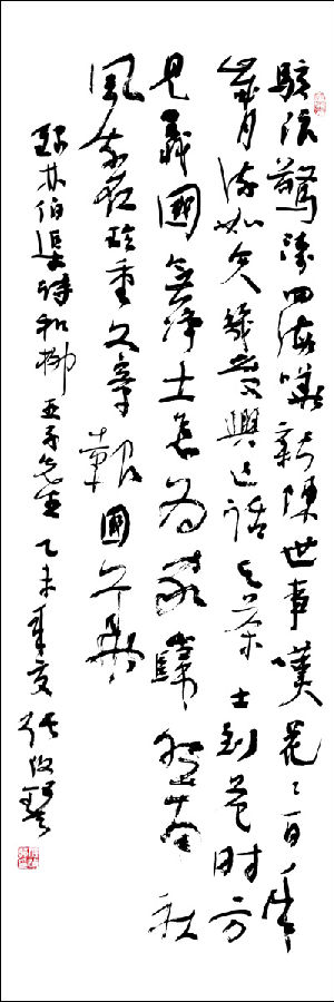 张改琴书法《林伯渠诗•和柳亚子先生》:“骇浪惊涛四海哗,新陈世事叹花花。百年岁月流如矢,几度兴亡话与茶。士到危时方见义,国无净土忘为家。岿然南社风流在,珍重文章报国华。 尺寸:41X122cm