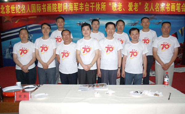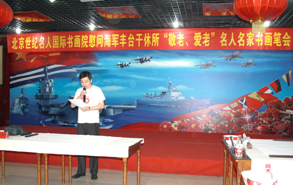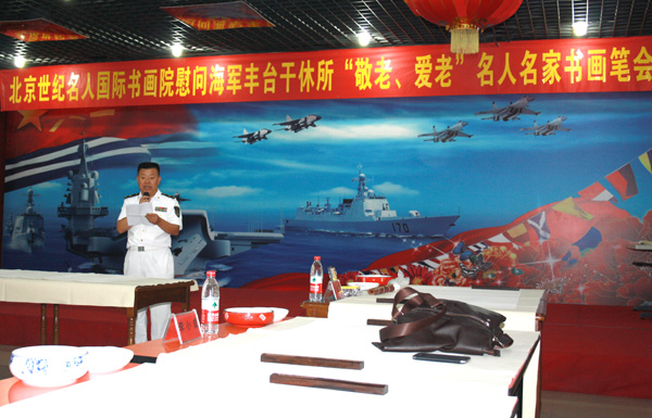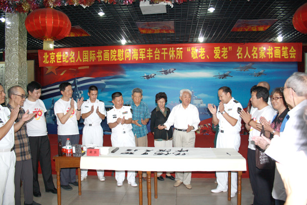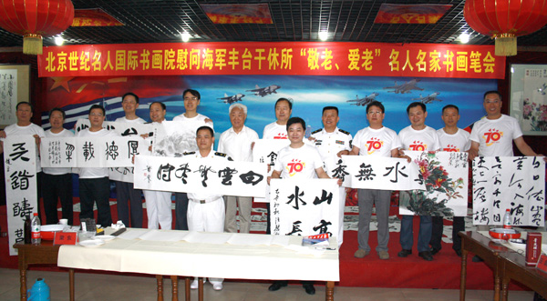 2015年9月9日下午,北京世纪名人国际书画院的书画家一行10余人专程来到海军丰台干休所,慰问老干部,并举行“敬老爱老”书画笔会。中国书协第三届理事、名人书画院副院长梁东,中国书协理事、名人书画院副院长朱守道,名人书画院副院长兼秘书长汪碧刚,名人书画院副秘书长赵勇、彭一超、李小成、钱建恒,中央国家机关美协常务副主席、名人书画院中国画创作委员会秘书长陈培伦,名人书画院中国画创作委员会委员孙德才、薛居波,名人书画院院士王建军以及中国书协会员、海军创作室创作员赵成建等参加笔会,受到老同志的欢迎。海军丰台干休所所长邓云富主持活动,梁东代表名人书画院致辞,政委周金明、副所长张华清和近百位离退休老干部参加了活动。