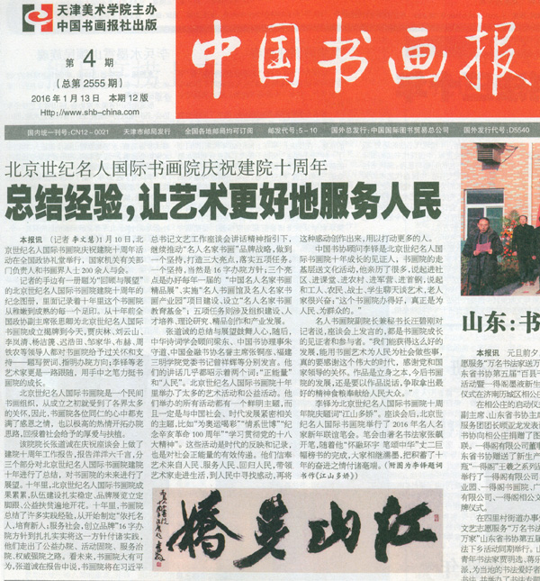2016年1月13日,《中国书画报》头版头条以“总结经验,让艺术更好地服务人民”为题报道了北京世纪名人国际书画院十周年院庆活动盛况。