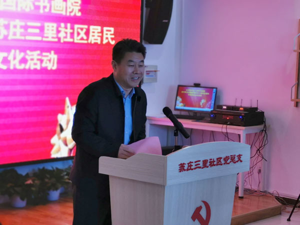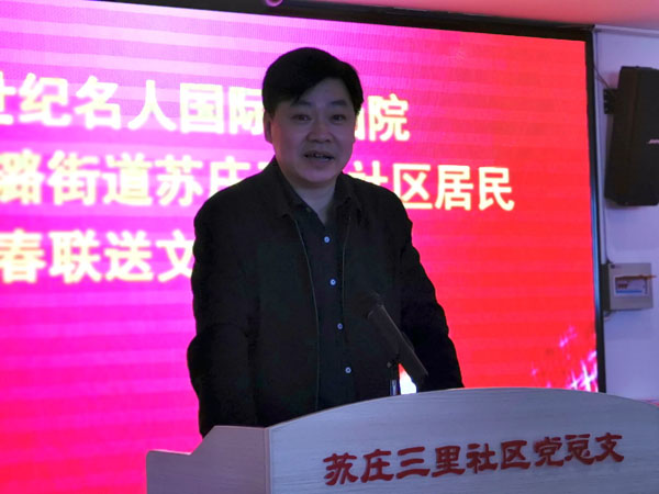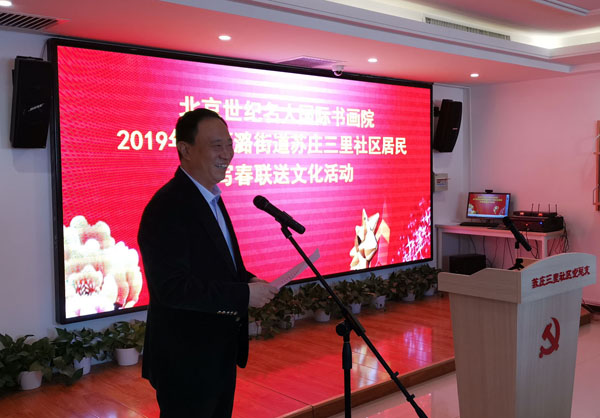 新春送欢乐,万福进万家。1月13日农历腊八,全国政协原副秘书长、北京世纪名人国际书画院院长张道诚率领该院书画家一行13人专程来到京郊房山区西潞街道办事处苏庄三里社区,与社区居民欢聚一堂,开展“义务写春联,新春送文化”进社区活动。北京市房山区人民政府副区长齐文东代表区委、区政府致欢迎词,房山区西潞街道工委书记李军、街道办事处主任邱刚、街道工委副书记王新华、街道工委组织部长解美玲、街道工委宣传部长郝爽,西潞街道苏庄三里社区党总支书记邵雪松以及苏庄三里社区的居民代表近百人参加活动。房山区西潞街道工委书记李军主持活动。