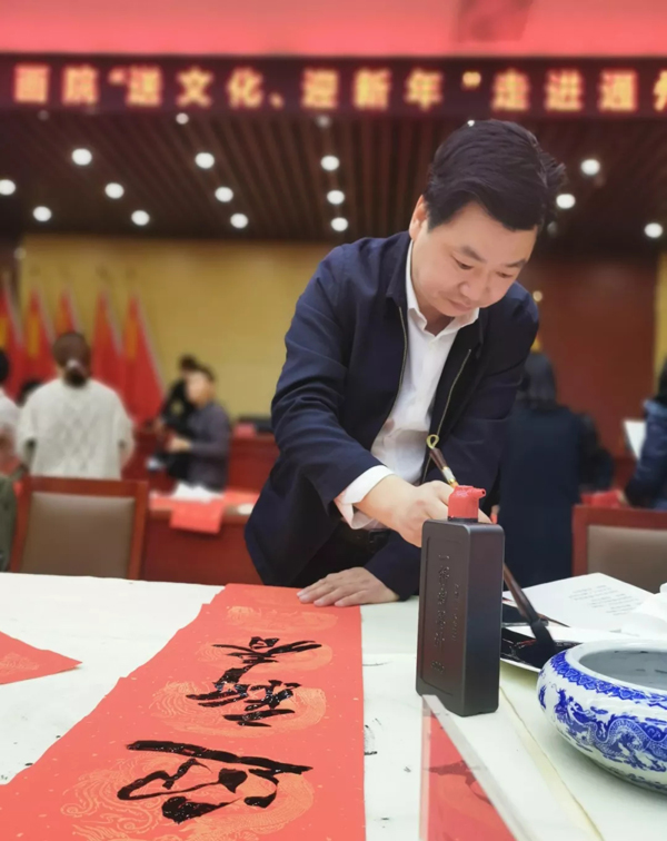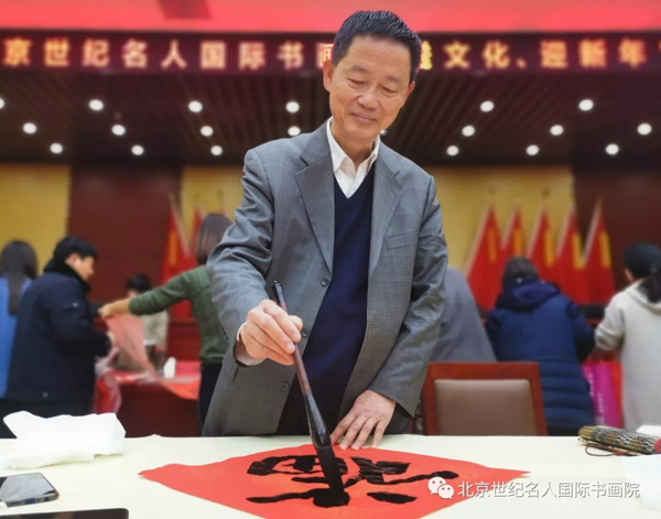 书画送下乡,百姓喜洋洋。在2020年元旦即将到来之际,2019年12月25日上午,全国政协原副秘书长、北京世纪名人国际书画院院长张道诚率领该院书画家一行11人来到北京市通州区潞城镇,与居民欢聚一堂,开展“送文化、迎新年”活动,义务为居民写春联。通州区人民政府副巡视员、区民政局党委书记储怀森,潞城镇党委书记吴孔安、副书记林广星,潞城镇党委宣传委员潘玉霞以及潞城镇的居民代表近百人参加活动,通州区潞城镇党委副书记林广星主持活动。