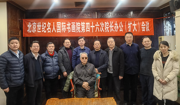 2023年2月10日,北京世纪名人国际书画院在京召开第46次院长办公(扩大)会议。全国政协原副秘书长、名人书画院院长张道诚主持并讲话。北京市政协委员、中国书协第六届青少年委员会委员、名人书画院副院长兼秘书长汪碧刚,名人书画院秘书处、中国画创作委员会、中国书法文化研究中心专家赵勇、彭一超、李小成、王巨亭、钱建恒、陈培伦、薛居波,办公室负责人刘欧祥等参加会议。